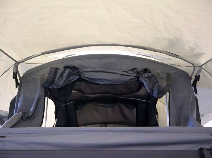 - Das vollabdeckende Außenzelt verfügt über transparente Sternenfenster, während das integrierte Vordach Eingang und Leiter zuverlässig schützt.