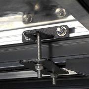 Die Montage ist mit dieser Halterung ohne Bohren auf dem Träger möglich. Die Halterungen werden in die T-Nut des Dachträgers geschraubt.