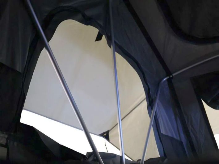 - Das vollabdeckende Außenzelt verfügt über transparente Sternenfenster, während das integrierte Vordach Eingang und Leiter zuverlässig schützt.