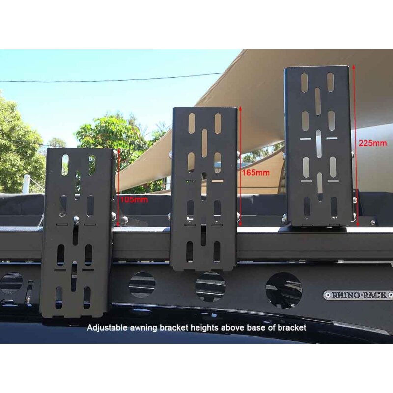 Die schraubbare Halterung besteht aus zwei Teilen: der untere Arm, der am Dachträger befestigt wird, ist 31 cm lang und 8,1 cm breit und verfügt über eine Reihe von Löchern und Schlitzen zur Befestigung vieler Markisen. Der Vorteil dieses längeren unteren Arms ist, dass er ideal an Dachträgern mit breiteren Streben, bei denen die Befestigungspunkte weiter voneinander entfernt sind, möglich ist (wie etwa auf einer Rhino Rack Pioneer Plattform oder den legendären Hannibal- bzw. Tembo-Dachträgern). Der vertikale Arm der Halterung kann in drei Höhen-Positionen eingebaut werden, so dass die Höhe über dem Rack entweder auf 22,5 cm, 16,5 cm oder 10,5 cm eingestellt werden kann.
