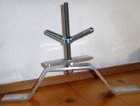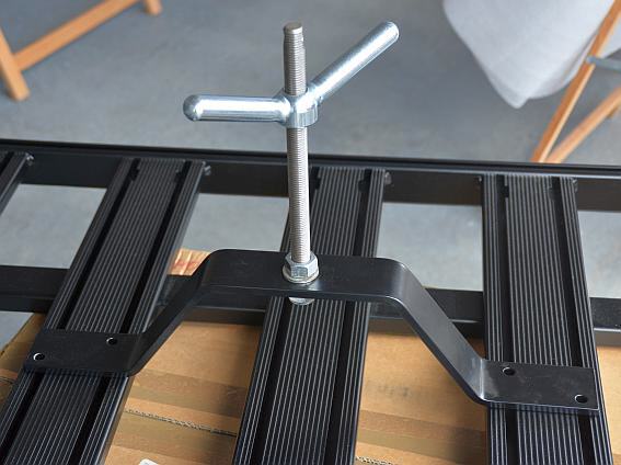 Die Halterung besteht aus einem Aluminium Profil, das man fest auf den Träger montiert. Das Rad wird dort eingelegt und von oben mit einem Teller und einer großen Flügelmutter festgezogen. Fertig.