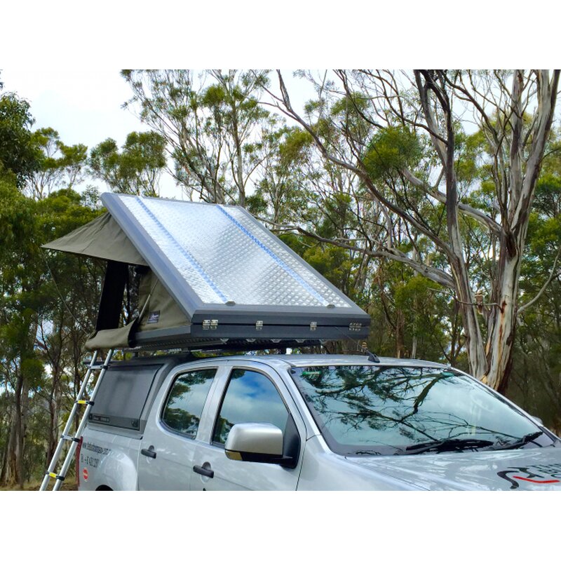 Das Alu - Dachzelt von Bush Company ist dank zweier Gasdruckfedern sehr schnell aufgebaut: