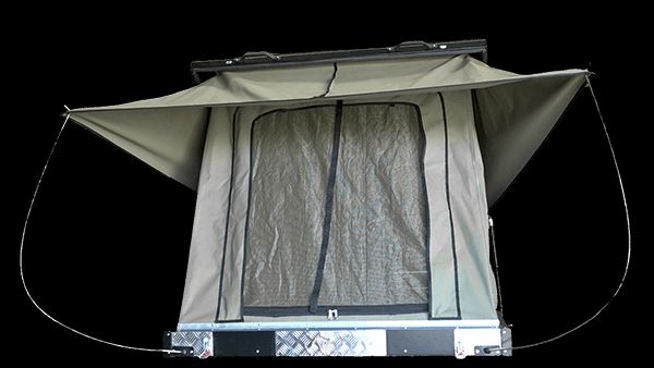 Auf dem Zeltdach sind zwei Aluminium C-Schienen angebracht. Darauf können Sie z.B. Querträger anbringen und schaffen sich dadurch weitere Staufläche. Das Dach ist zusätzlich mit 50 kg belastbar (geschlossen sogar bis ca. 200 kg !).