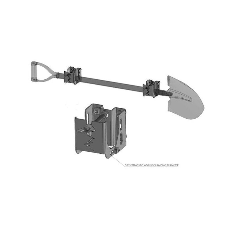 Mit dieser zweiteiligen Halterung können Sie bequem und schnell eine Schaufel an den seitlichen Nuten des Bush Company Dachzelts Alpha befestigen.
