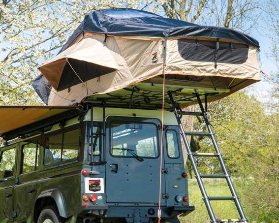 Zusätzliche Details: Rund um das Expedition Dachzelt sind Reißverschlüsse mit Eingangsabdeckungen und Moskitonetzen verbaut. Das "Flysheet" (Überdach) bietet Schatten und zugleich eine umfangreiche Belüftung. Dadurch wird der Schlafbereich durch Luftzirkulation mit Frischluft versorgt. Dank der ausgeklügelten Dachzelt-Konstruktion kann das Bettzeug während der Fahrt im Zelt verbleiben. Die mitgelieferte schwarz-eloxierte Teleskopleiter kann einfach an unterschiedliche Fahrzeughöhen bis auf eine Höhe von 230cm angepasst werden. Der Innenbereich ist mit Taschen und Netzen für Kleidung, Bücher und diverse Dinge ausgestattet. Offroadlampen und Taschenlampen können befestigt werden.
