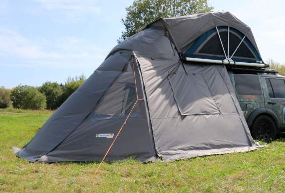 Das geräumige Vorzelt für das YUNA von Sheepie hat eine Grundfläche von etwa 3,5 x 4 Meter. Es bietet genügend Raum etwa für ein zusätzliches Feldbett oder eine Matratze bzw. Platz für den Hund aber auch einen Campingtisch samt Campingstühlen. Das Vorzelt eignet sich für Montagehöhen von 1,70 bis 2,10 Meter und passt deshalb auch ideal auf SUVs, Geländewagen und höhere Pkw.