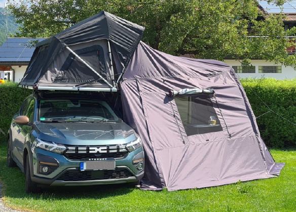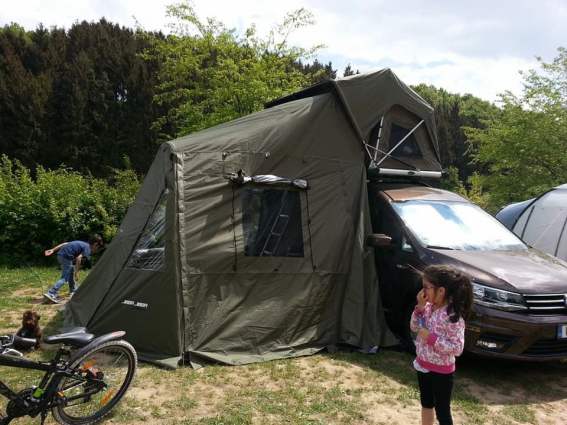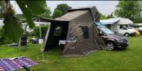 Dieses geräumige Vorzelt bietet zusätzlichen Wohnraum an der Seite des Fahrzeugs. Es hat Fenster und erweitert Ihren Aufenthaltsbereich rund um das Jimba Jimba enorm. Gerade bei Regen bietet es viel Platz.
