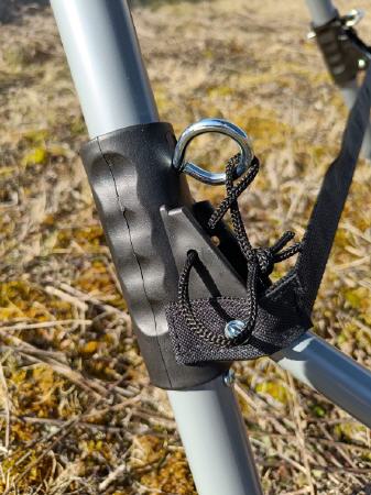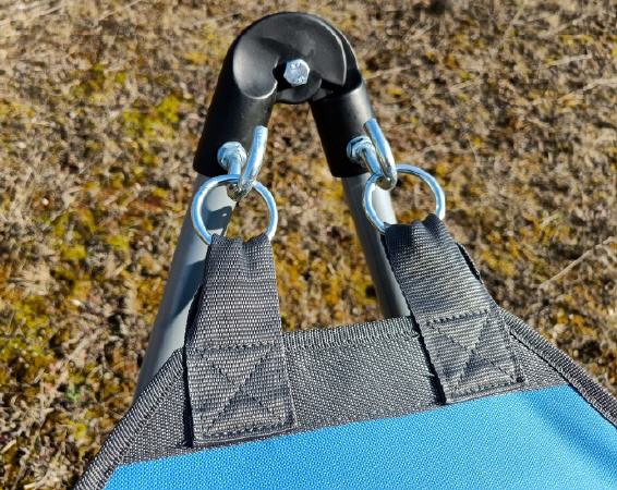 Der pulverbeschichtete Metallrahmen ist X-förmig und verfügt über einen sechsbeinigen Ständer, der bis zu 150 kg Gewicht tragen kann. Verstärkte Gurte auf beiden Seiten und Doppelhaken sorgen für optimale Stabilität.