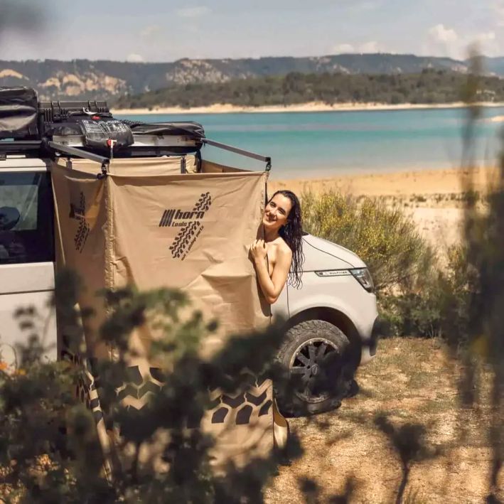 Ein Duschzelt ist eine sinnvolle Ergänzung bei Offroad- und Abenteuertouren. Es eignet sich auch ideal als Umkleidekabine oder zum Abstellen einer Toilette. Dieses Zelt des österreichischen Offroad-Ausrüsters Horntools ist leicht an fast jedem Dachträger zu montieren und schnell aufgeklappt. Zusammengeklappt hängt es in einem Markisensack seitlich am Fahrzeug. Am Eingang ist ein Reißverschluss eingenäht und eingearbeitete kleine Stangen dienen als Gewichte, die das Duschzelt auch bei Wind formstabil halten.