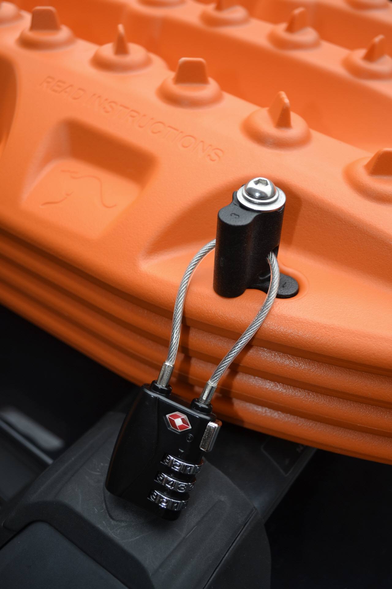 Die Maxtrax können an dieser Halterung leicht mit einem Vorhängeschloss vor Diebstahl geschützt werden.